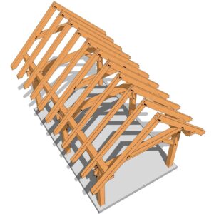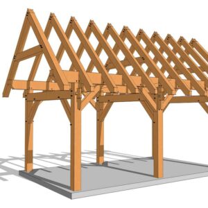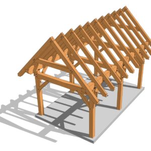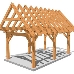 This 12x20 timber frame has a compact footprint. It measures 12’ wide x 20’ long and has a 12-inch roof pitch (45 degrees). It is designed with common trusses, making it a relatively simple frame to cut. This frame can be used as a small cabin, pavilion or a shed for your backyard.
