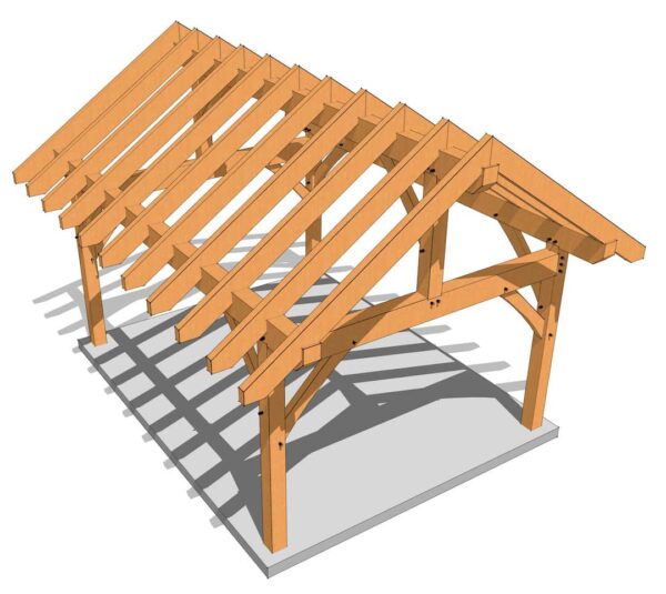 This 14x18 king post is a two-bent timber frame shed plan featuring an 8:12 roof pitch. While the plan has an 8″ roof pitch by default we have added the dimensions for 3, 4, 5, 6, 7, 9, 10, 11, 12-inch roof pitches to allow you the option to choose. This size and shape are perfect for a small cabin, workshop or storage shed, and the plans are easily customizable to suit your specific needs.