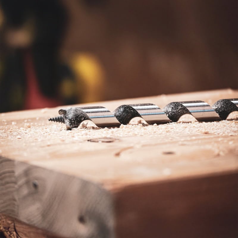- Threaded self-feeding tip — draws the bit through wood automatically, reducing operator fatigue on long passes
